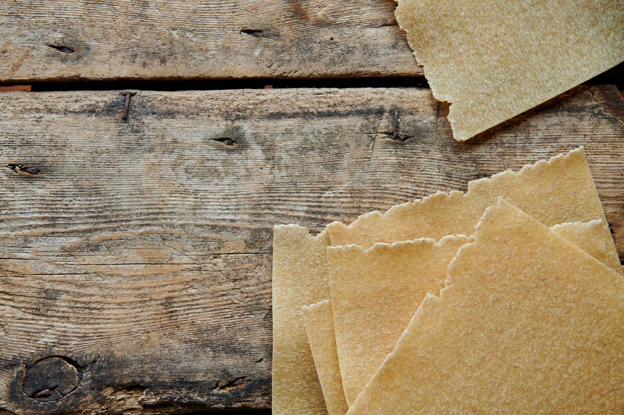 Onze lasagnevellen zijn 1,2 mm dik. Voor de productie zijn 2 machines nodig: een meng-extrudeermachine en een lamineermachine die het deeg in vellen snijdt. Daarna volgt het handwerk om ze goed op de rekken uit te spreiden, zodat we een optimale droging kunnen garanderen.